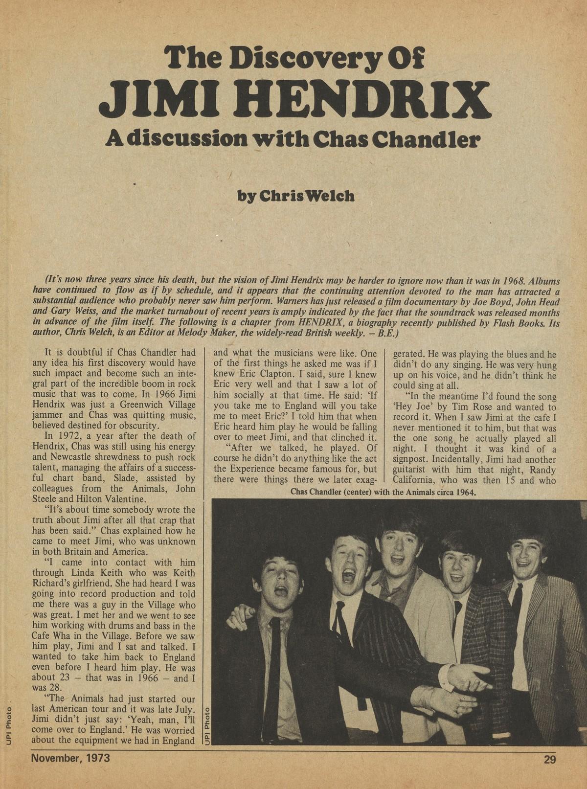 It is doubtful if Chas Chandler had any idea his first discovery would have such impact and become such an integral part of the incredible boom in rock music that was to come. In 1966 Jimi Hendrix was just a Greenwich Village jammer and Chas was quitting music, believed destined for obscurity.