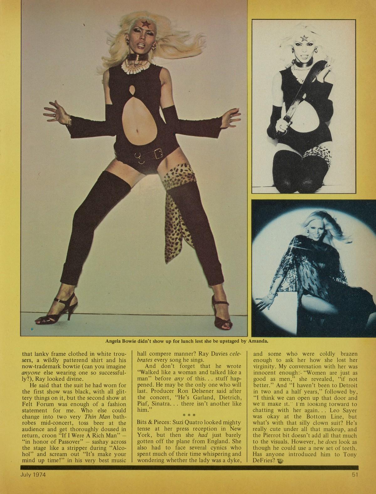 "Gary Glitter certainly killed glamrock for good," the stunning blond murmured in her sultry voice at the Four Seasons. "I mean no one would be caught dead wearing a glitter jacket now, and my dear... those girdles he wears. . ."
