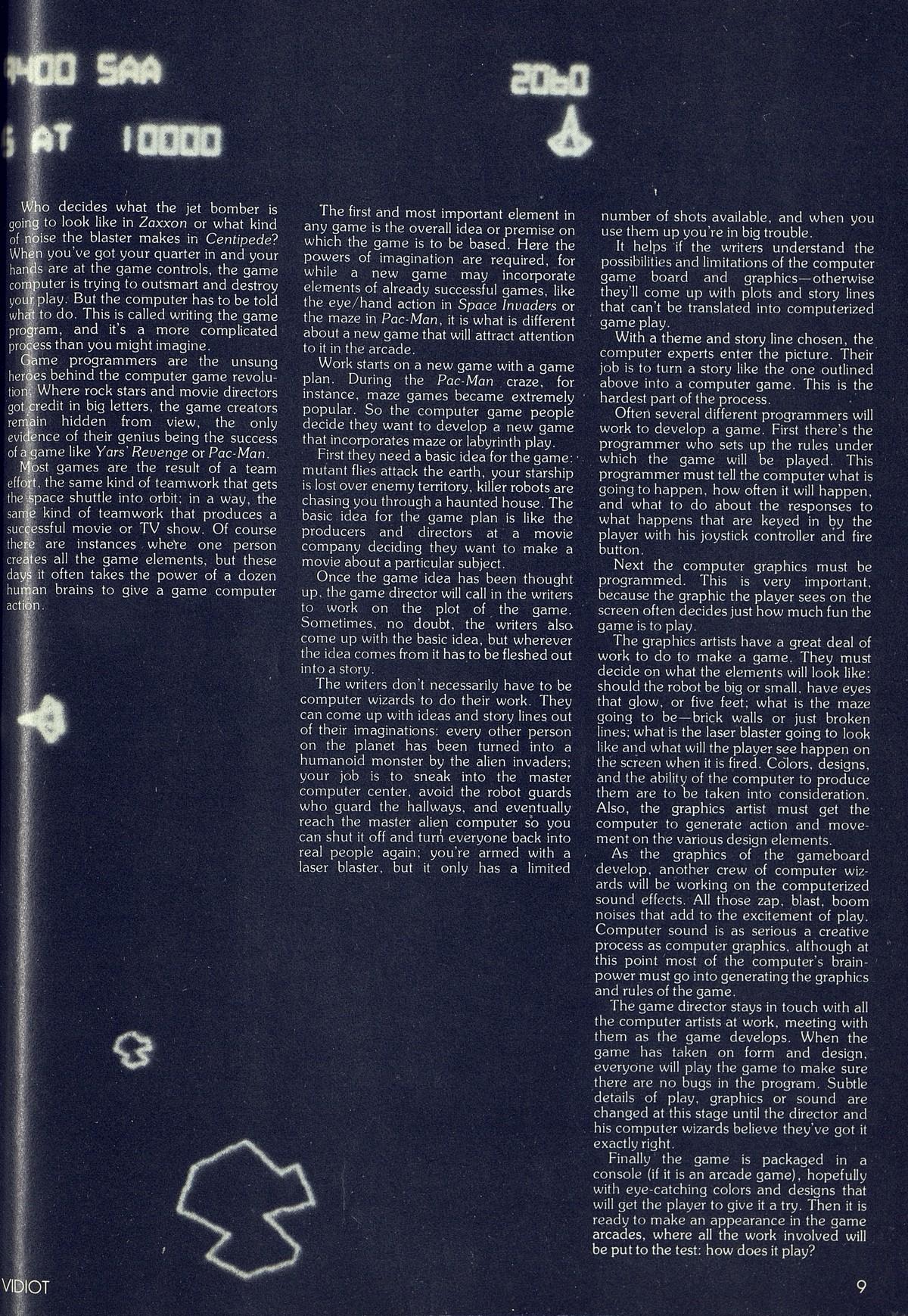 Who decides what the jet bomber is going to look like in Zaxxon or what kind of noise the blaster makes in Centipede? When you’ve got your quarter in and your hands are at the game controls, the game computer is trying to outsmart and destroy your play. But the computer has to be told what to do. This is called writing the game program, and it’s a more complicated process than you might imagine.