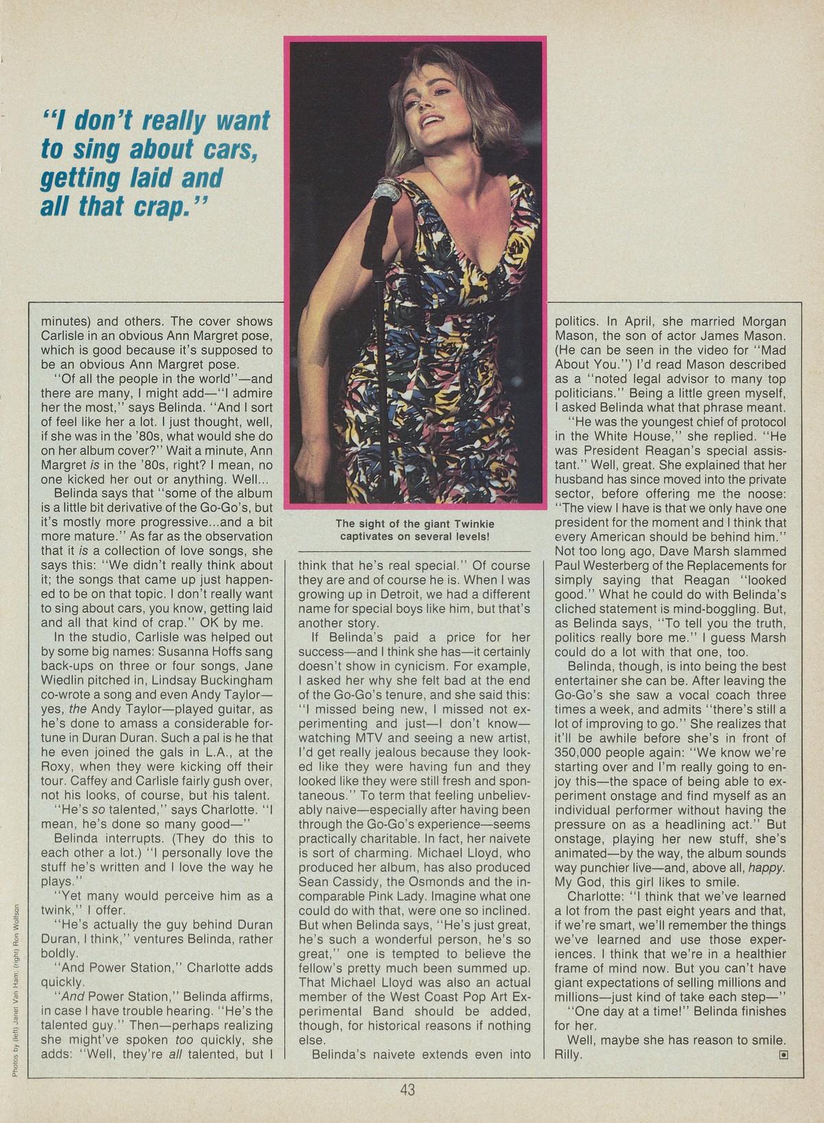 A couple of years ago, Belinda Carlisle’s life was everything it wasn’t supposed to be. The band she sang for, the GoGo’s, had established themselves as one of the most massively popular all-girl groups ever with Beauty & The Beat and Vacation. They were foisted on the public as fun, bubbly, effervescent California girls singing about inconsequential—yet happy—things.