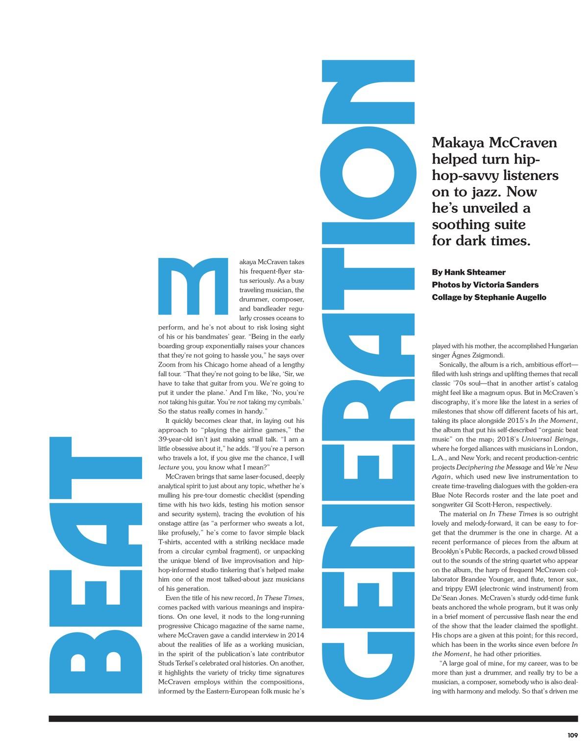 Makaya McCraven takes his frequent-flyer status seriously. As a busy traveling musician, the drummer, composer, and bandleader regularly crosses oceans to perform, and he’s not about to risk losing sight of his or his bandmates’ gear. “Being in the early boarding group exponentially raises your chances that they’re not going to hassle you,” he says over Zoom from his Chicago home ahead of a lengthy fall tour. “That they’re not going to be like, ‘Sir, we have to take that guitar from you. We’re going to put it under the plane.’ And I’m like, ‘No, you’re not taking his guitar. You’re not taking my cymbals.’ So the status really comes in handy.”