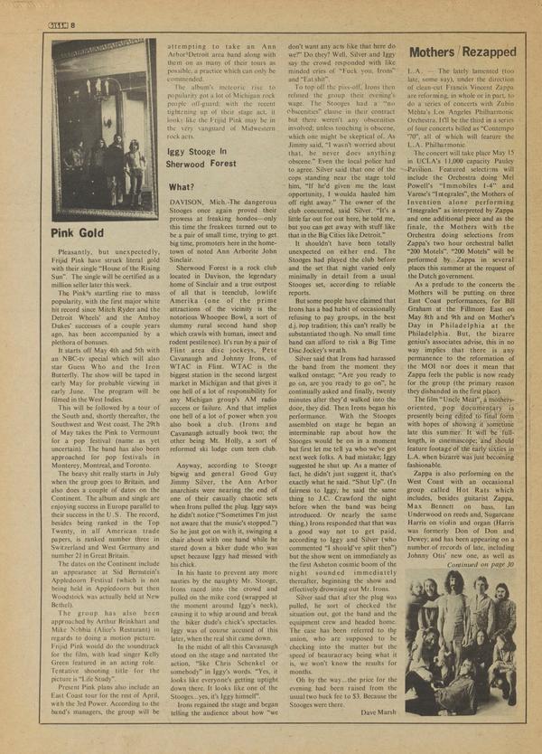ON THE LOCAL SCENE-The Stooges, as bizarre-o and twist-o as ever, have been exposing themselves in new areas, not the least of which is St. Louis, where they completely stunned the audience at the St. Louis Pop Festival and returned two weeks later as “The Rolling Stones of St. Louis.”