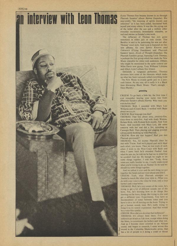 (Leon Thomas first became known to us through Pharoah Sanders’ album Karma (Impulse). His near-yodel, “the moaning of spirits known and unknown” as it has been called, fascinated both myself and many others. It was like the crying out of the father after the son and a million other everyday occurences; immediately relatable, as real and intense as Sander’s own work.