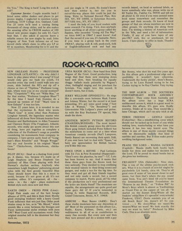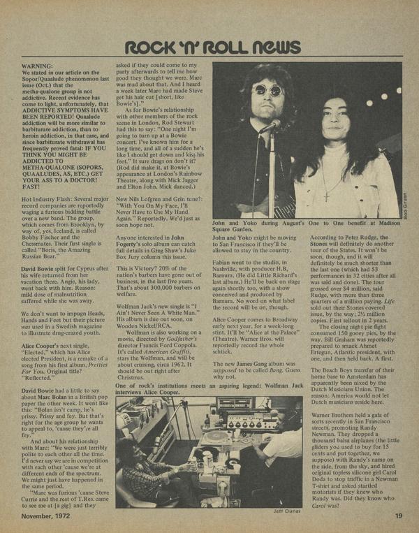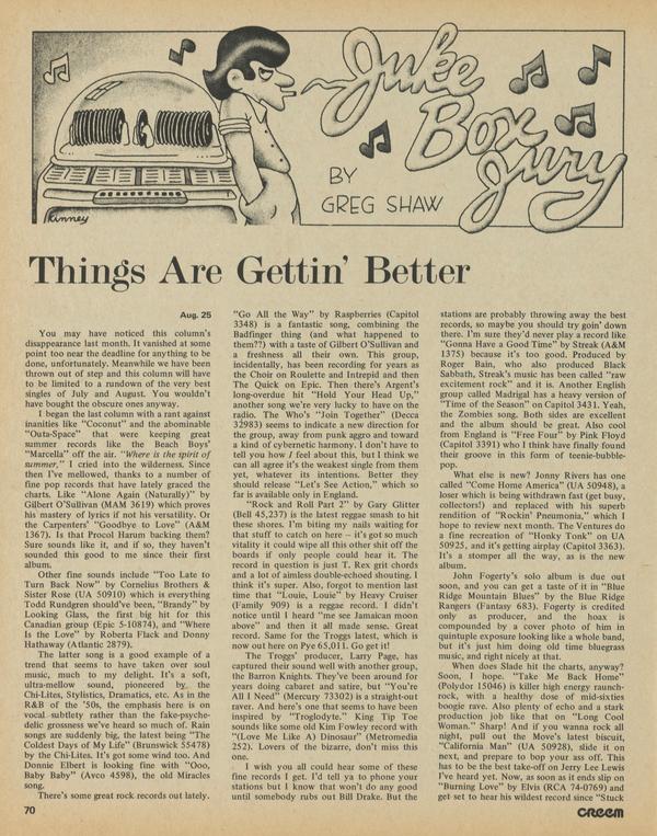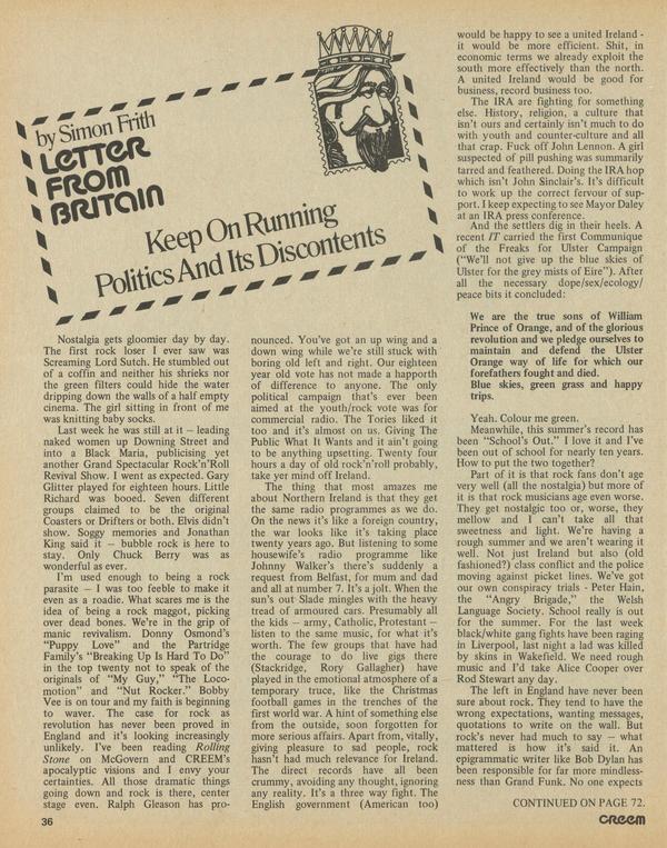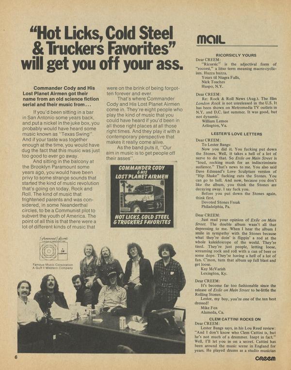 RICORSICLY YOURS Dear CREEM: “Ricorsic” is the adjectival form of “rocorsi,” a litso term meaning macro-cyclicism. Huzza huzza. Yours til Niagra Falls, Nick Tosches Huspo, N.Y. Dear CREEM: Re: Rock & Roll News (Aug.). The film London Rock is not unreleased in the U.S.