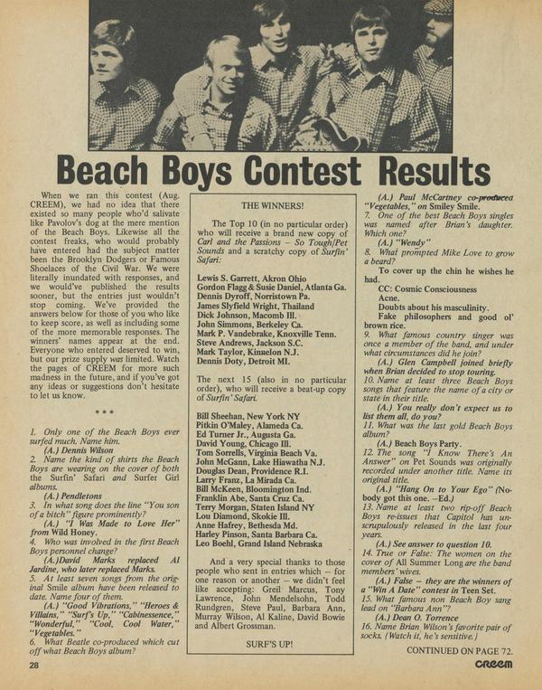 When we ran this contest (Aug. CREEM), we had no idea that there existed so many people who'd salivate like Pavolov’s dog at the mere mention of the Beach Boys. Likewise all the contest freaks, who would probably have entered had the subject matter been the Brooklyn Dodgers or Famous Shoelaces of the Civil War.