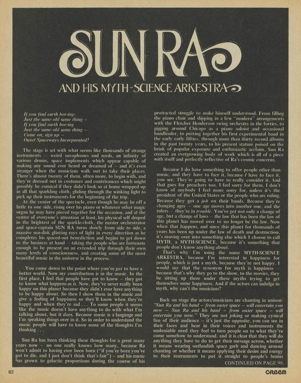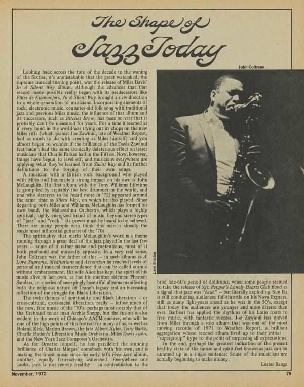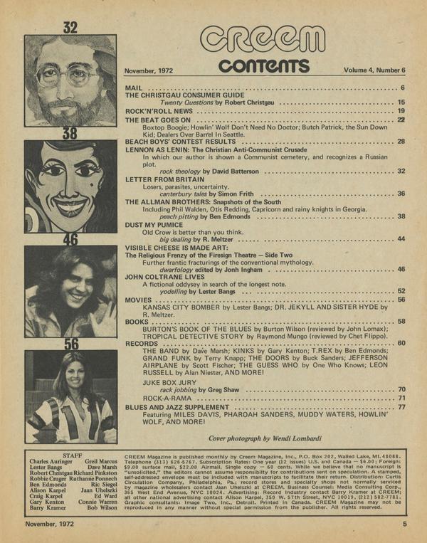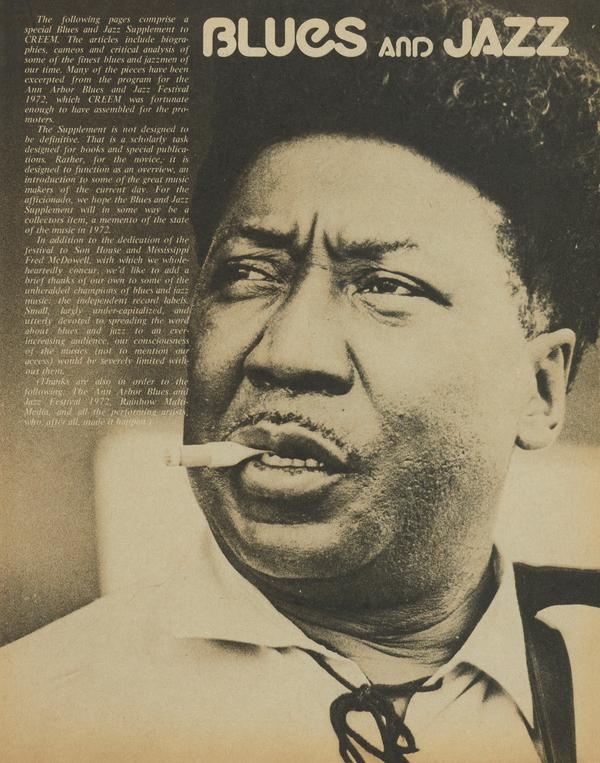 The following pages comprise a special Blues and Jazz Supplement to CREEM. The articles include biographies, cameos and critical analysis of some of the finest blues and jazzmen of our time. Many of the pieces have been excerpted from the program for the Ann Arbor Blues and Jazz Festival 1972, which CREEM was fortunate enough to have assembled for the promoters.