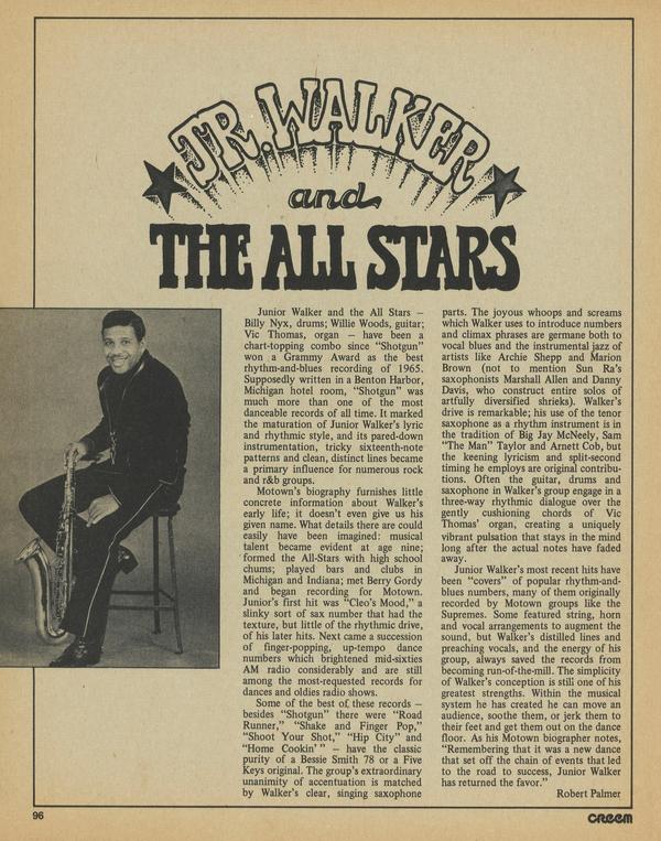 Junior Walker and the All Stars — Billy Nyx, drums; Willie Woods, guitar; Vic Thomas, organ — have been a chart-topping combo since “Shotgun” won a Grammy Award as the best rhythm-and-blues recording of 1965. Supposedly written in a Benton Harbor, Michigan hotel room, “Shotgun” was much more than one of the most danceable records of all time.