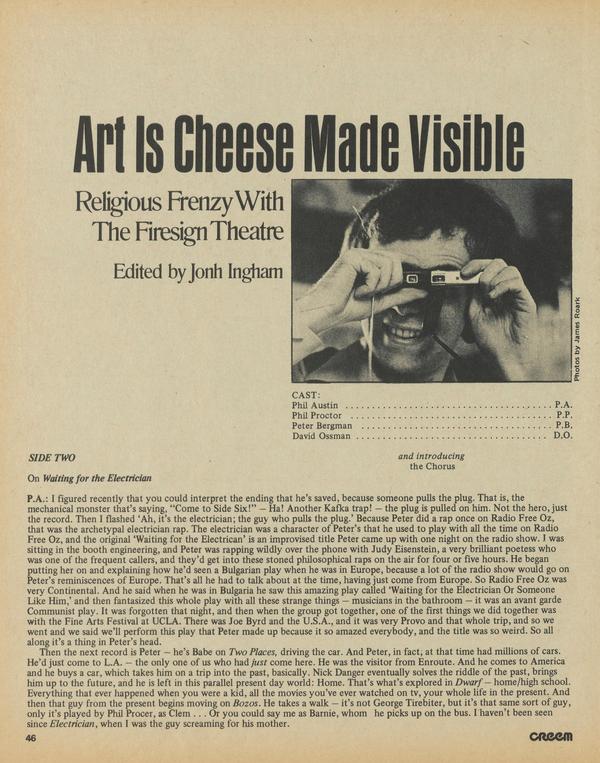 SIDE TWO On Waiting for the Electrician P.A.: I figured recently that you could interpret the ending that he’s saved, because someone pulls the plug. That is, the mechanical monster that’s saying, “Come to Side Six!” — Ha! Another Kafka trap! — the plug is pulled on him.
