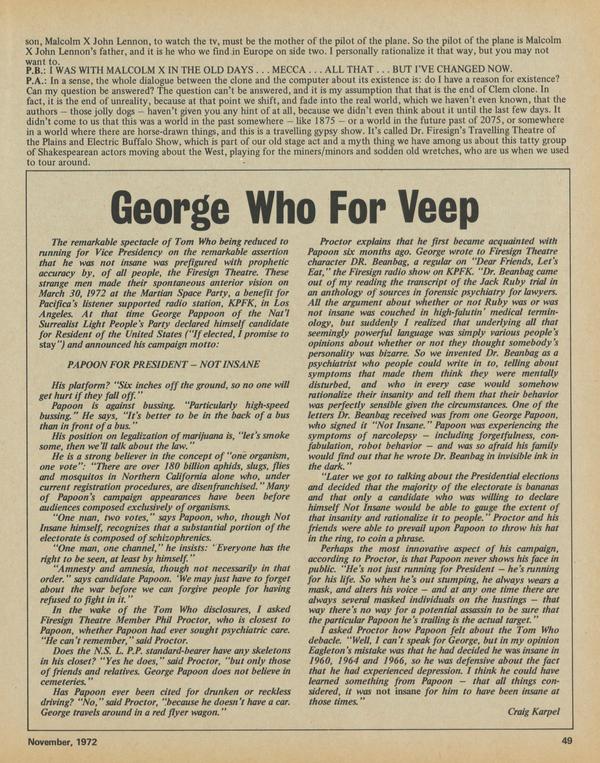The remarkable spectacle of Tom Who being reduced to running for Vice Presidency on the remarkable assertion that he was not insane was prefigured with prophetic accuracy by, of all people, the Firesign Theatre. These strange men made their spontaneous anterior vision on March 30, 1972 at the Martian Space Party, a benefit for Pacifica's listener supported radio station, KPFK, in Los Angeles.