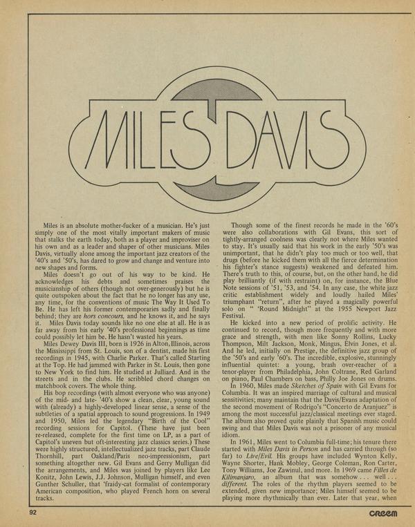 Miles is an absolute mother-fucker of a musician. He’s just simply one of the most vitally important makers of music that stalks the earth today, both as a player and improviser on his own and as a leader and shaper of other musicians. Miles Davis, virtually alone among the important jazz creators of the ’40’s and ’50’s, has dared to grow and change and venture into new shapes and forms.