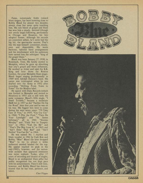 Fame, notoriously fickle toward blues singers, has been hovering close to Bobby Bland for almost two decades; always close but never quite touching him. His rich blend of gospel and blues has won him a steady, devoted (though not overly large) following, particularly in Chicago and Houston, his two adopted homes.