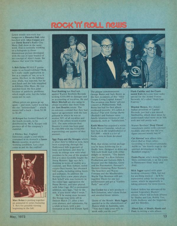Latest trendy non-rock star hanger-on is Slavador Dali, who lunched with Alice Cooper and saw David Bowie’s Radio City Music Hall show in the same week. Dali is currently working on a hologram (a three-dimensional picture developed with the use of laser beams) of his concept of Alice’s brain.