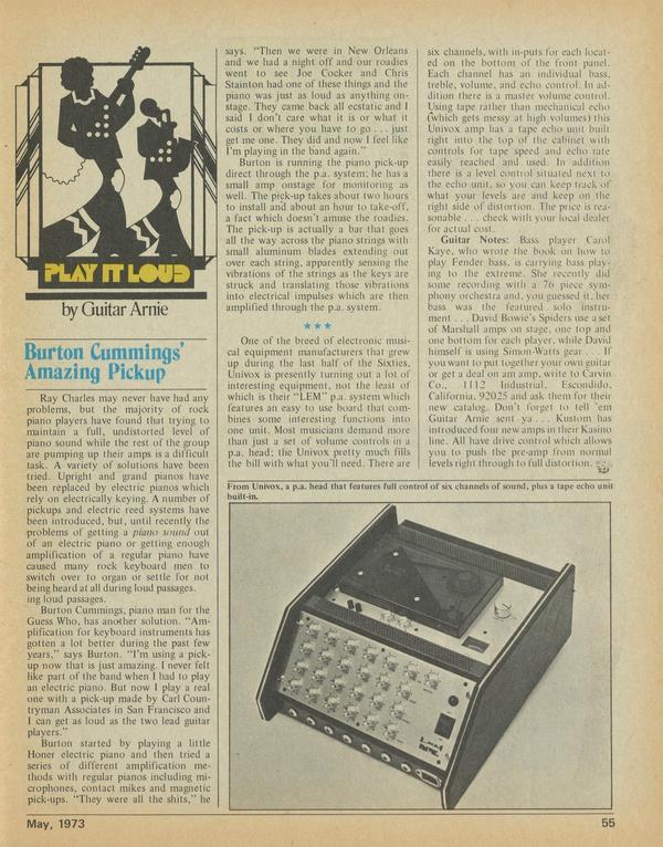 Ray Charles may never have had any problems, but the majority of rock piano, players have found that trying to maintain a full, undistorted level of piano sound while the rest of the group are pumping up their amps is a difficult task. A variety of solutions have been tried.