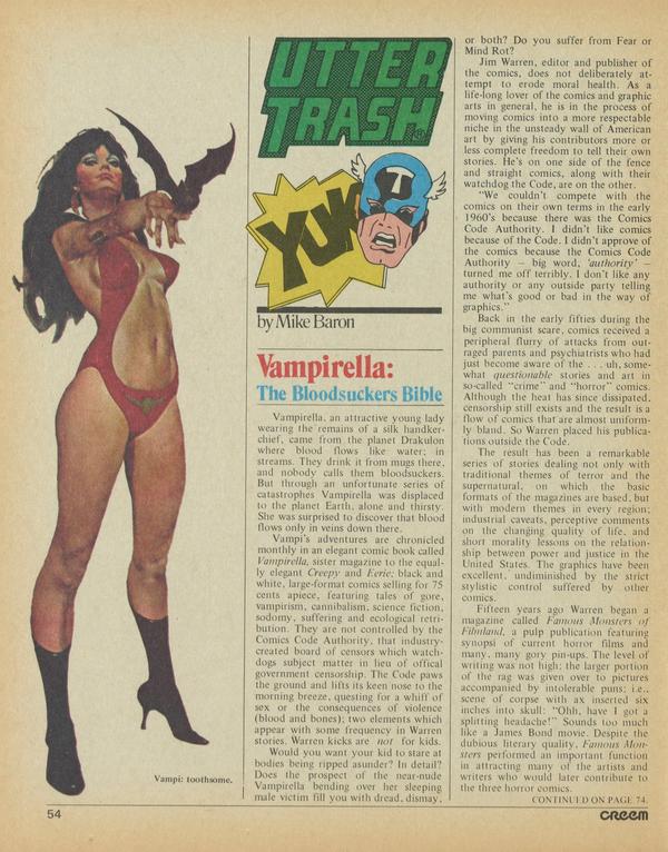 Vampirella, an attractive young lady wearing the remains of a silk handkerchief, came from the planet Drakulon where blood flows like water; in streams. They drink it from mugs there, and nobody calls them bloodsuckers. But through an unfortunate series of catastrophes Vampirella was displaced to the planet Earth, alone and thirsty.