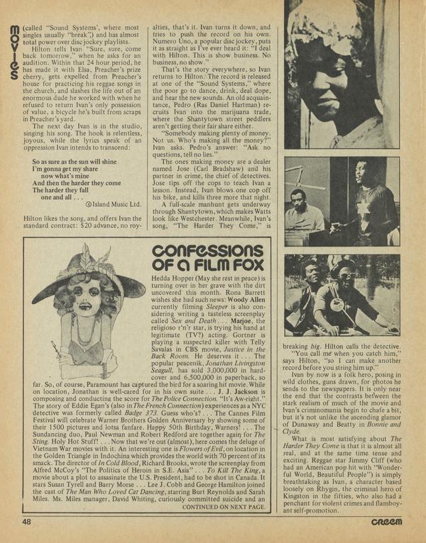 Hedda Hopper (May she rest in peace) is turning over in her grave with the dirt uncovered’ this month. Rona Barrett wishes she had such news: Woody Allen currently filming Sleeper is also considering writing a tasteless screenplay called Sex and Death... Marjoe, the religioso r‘n’r star, is trying his hand at legitimate (TV?) acting.