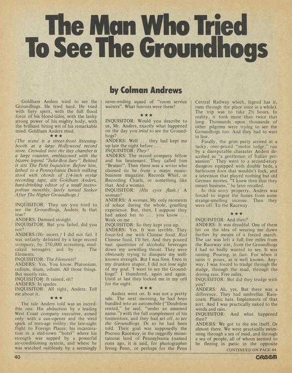 Goldham Anders tried to see the Groundhogs. He tried hard. He tried with fiery spirit, with the full flood force of his blood-tides, with the lanky strong power of his mighty body, with the brilliant biting wit of his remarkable mind. Goldham Anders tried.