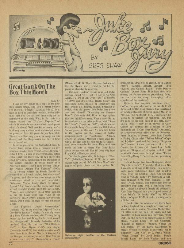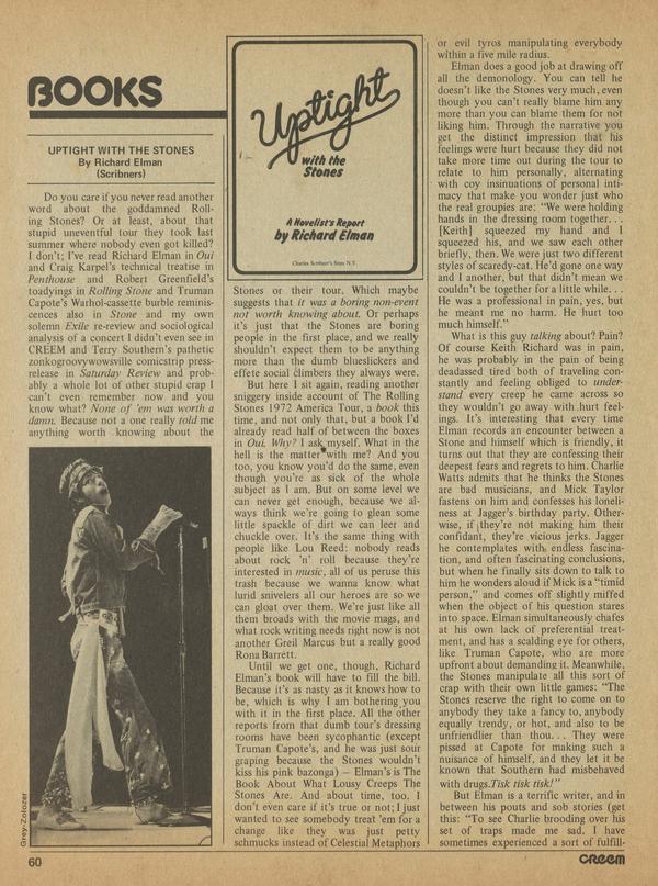 Do you care if you never read another word about the goddamned Rolling Stones? Or at least, about that stupid uneventful tour they took last summer where nobody even got killed? I don’t; I’ve read Richard Elman in Oui and Craig Karpel’s technical treatise in Penthouse and Robert Greenfield’s toadyings in Rolling Stone and Truman Capote’s Warhol-cassette burble reminiscences also in Stone and my own solemn Exile re-review and sociological analysis of a concert I didn’t even see in CREEM and Terry Southern’s pathetic zonkogroovywowsville comicstrip press-release in Saturday Review and probably a whole lot of other stupid crap I can’t even remember now and you, know what?