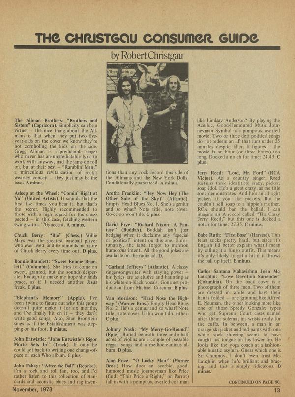 The Allman Brothers: “Brothers and Sisters” (Capricorn). Simplicity can be a virtue — the nice thing about the Allmans is that when they put two fiveyear-olds on the cover we know they’re not cornholing the kids on the side. Gregg Allman is a predictable singer who never has an unpredictable lyric to work with anyway, and the jams do roll on, but at their best — “Ramblin’ Man,” a miraculous revitalization of rock’s weariest conceit — they just may be the best.