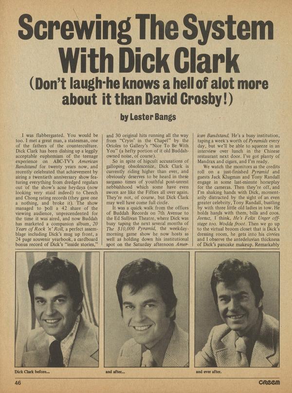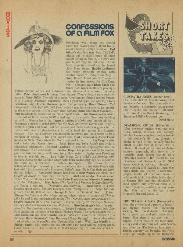 Wondering what things you should know but haven’t heard about Hollywood’s honeys lately? Read on! Earl Wilson’s deadline may beat CREEM’s release but he didn’t catch all these scoops sitting in Sardi’s... Here’s one you folkies may be hot about: Leadbelly, a picture based on the famed black blues singer, Huddie Ledbetter has begun principle photog with Gordon Parks Sr. (Shaft) directing... Ossie Davie’ Third World Cinema is starting its first project for 20th Cent.