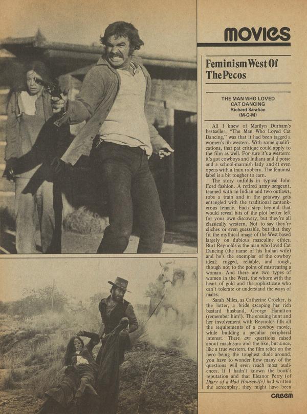 All I knew of Marilyn Durham’s bestseller, “The Man Who Loved Cat Dancing,” was that it had been tagged a women’s-lib western. With some qualifications, that pat critique could apply to the film as well. For sure it’s a western: it’s got cowboys and Indians and a posse and a school-marmish lady and it even opens with a train robbery.