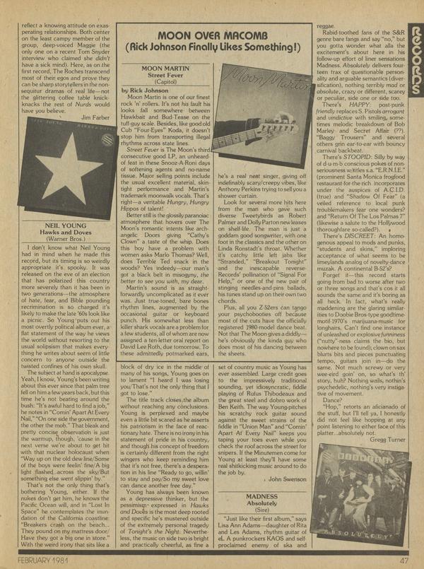 Moon Martin is one of our finest rock ’n’ rollers. It’s not his fault his looks fall somewhere between Hawkbait and Bud-Tease on the tuff-guy scale. Besides, like good old Cub “Four-Eyes” Koda, it doesn’t stop him from transporting illegal rhythms across state lines.