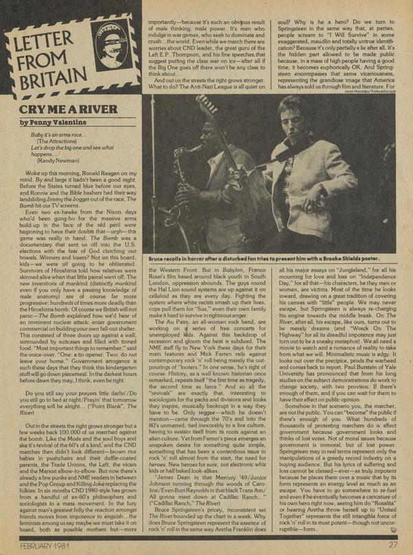 Baby it's an arms race... (The Attractions) Let's drop the big one and see what happens... (Randy Newman) Woke up this morning, Ronald Reagan on my mind. By and large it hadn't been a good night. Before the States turned blue before our eyes, and Ronnie and the Bible bashers had their way landsliding Jimmy the Jogger out of the race, The Bomb hit our TV screens.