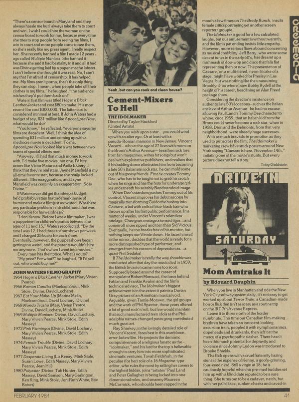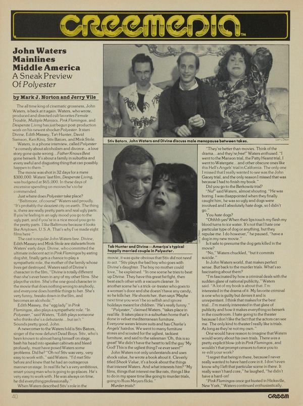 The all time king of cinematic grossness, John Waters, is back at it again. Waters, who wrote, produced and directed cult favorites Female Trouble, Multiple Maniacs, Pink Flamingos, and Desperate Living has just begun post-production work on his newest shocker Polyester.