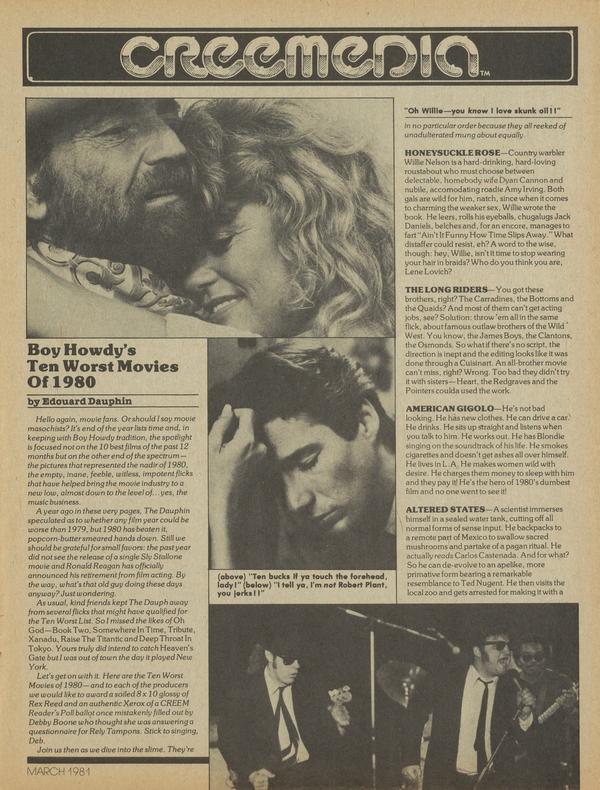 Hello again, movie fans. Or should I say movie masochists? It's end of the year lists time and, in keeping with Boy Howdy tradition, the spotlight is focused not on the 10 best films of the past 12 months but on the Other end of the spectrum — the pictures that represented the nadir of 1980, the empty, inane, feeble, witless, impotent flicks that have helped bring the movie industry to a new low, almost down to the level of...yes, the music business.