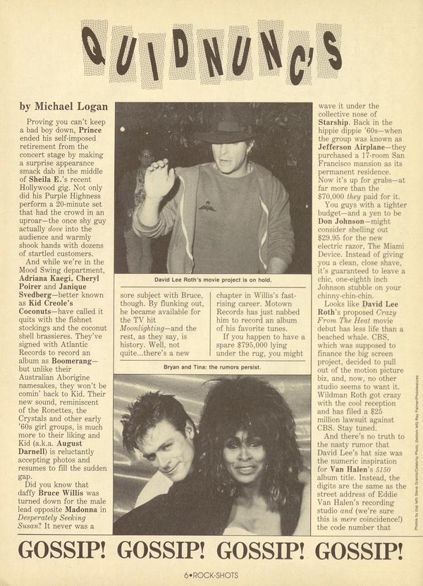 Boy, the stars are sure saying some goofy stuff this month! It’s hard to believe, but (fortunately for us) all the great ROCK-SHOTS photographers carry tape recorders with them at all times...thus, we know the captions you read are accurate to the last italics.