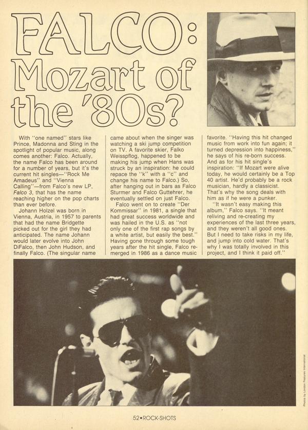 With “one named” stars like Prince, Madonna and Sting in the spotlight of popular music, along comes another: Falco. Actually, the name Falco has been around for a number of years, but it’s the current hit singles—“Rock Me Amadeus” and “Vienna Calling”—from Falco’s new LP, Falco 3, that has the name reaching higher on the pop charts than ever before.