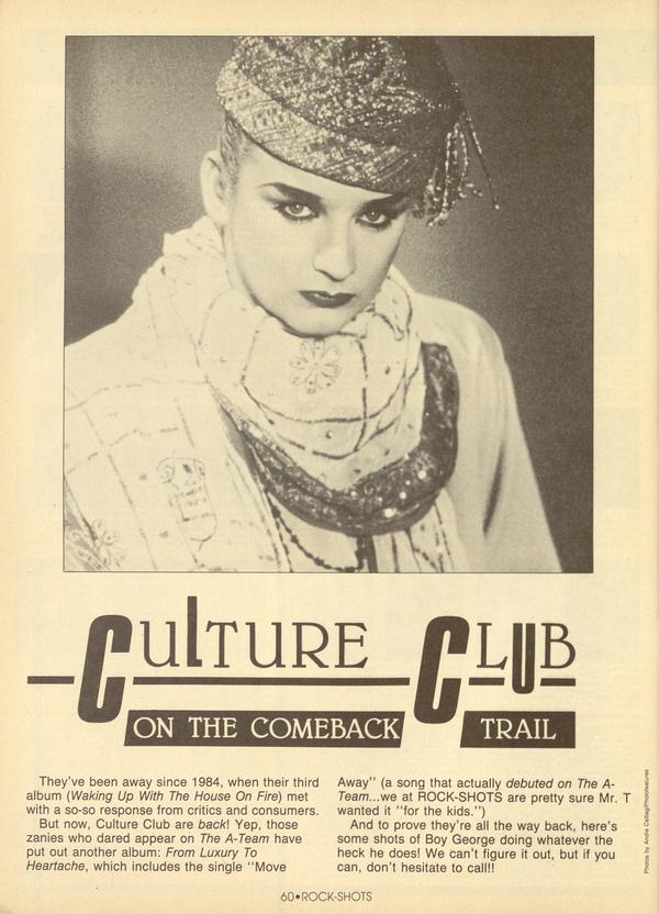They’ve been away since 1984, when their third album (Waking Up With The House On Fire) met with a so-so response from critics and consumers. But now, Culture Club are back! Yep, those zanies who dared appear on The A-Team have put out another album: From Luxury To Heartache, which includes the single “Move Away" (a song that actually debuted on The ATeam...we at ROCK-SHOTS are pretty sure Mr. T wanted it “for the kids.”)