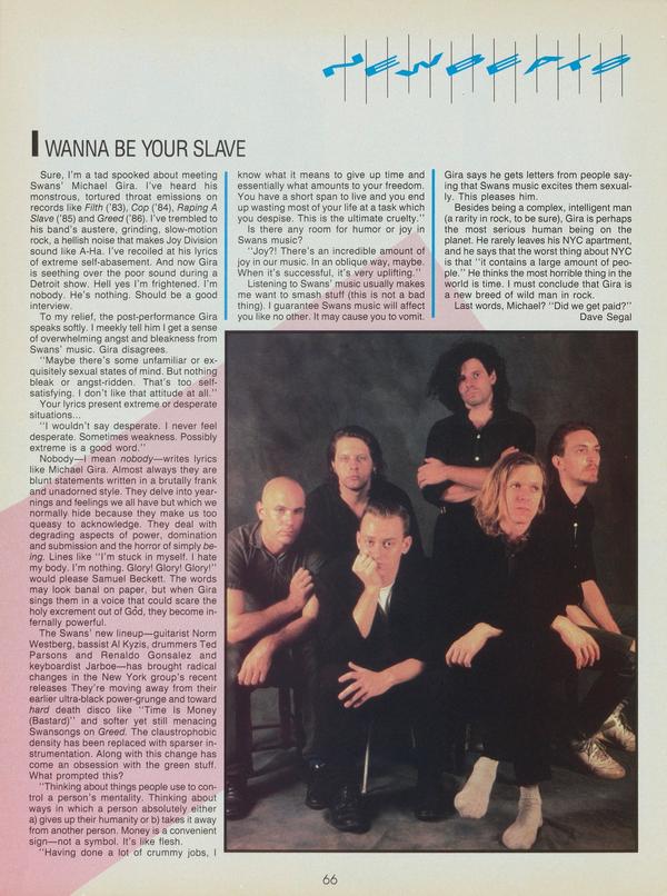 I WANNA BE YOUR SLAVE Sure, I’m a tad spooked about meeting Swans’ Michael Gira. I’ve heard his monstrous, tortured throat emissions on records like Filth (’83), Cop (’84), Raping A Slave (’85) and Greed (’86). I’ve trembled to his band’s austere, grinding, slow-motion rock, a hellish noise that makes Joy Division sound like A-Ha.