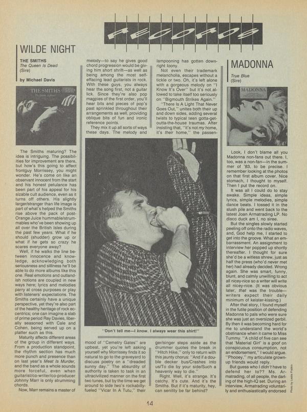 The Smiths maturing? The idea is intriguing. The possibilities for improvement are there, but how’s this going to affect frontguy Morrissey, you might wonder. He’s come on like an observant innocent from the start and his honest petulance has been part of his appeal for his sizable cult audience, even as it turns off others.