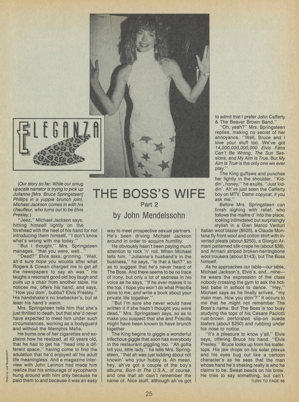 (Our story so far: While our smug upscale narrator is trying to pick up Julianne [Mrs. Bruce Springsteen] Phillips in a yuppie brunch joint, Michael Jackson comes in with his chauffeur, who turns out to be Elvis Presley.) “Jeez,” Michael Jackson says, hitting himself lightly on the forehead with the heel of his hand for not introducing them himself, “I don’t know what’s wrong with me today.”