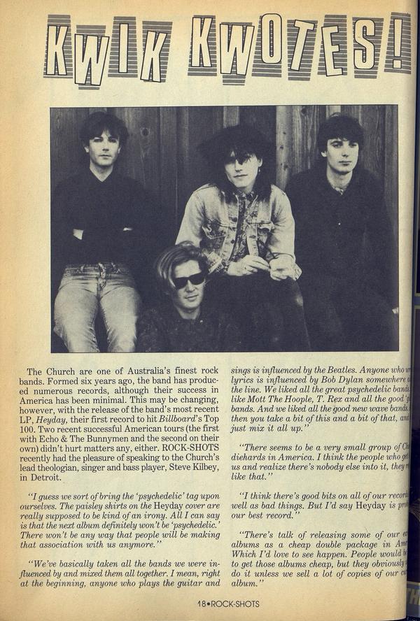 The Church are one of Australia’s finest rock bands. Formed six years ago, the band has produced numerous records, although their success in America has been minimal. This may be changing, however, with the release of the band’s most recent LP, Heyday, their first record to hit Billboard’s Top 100.