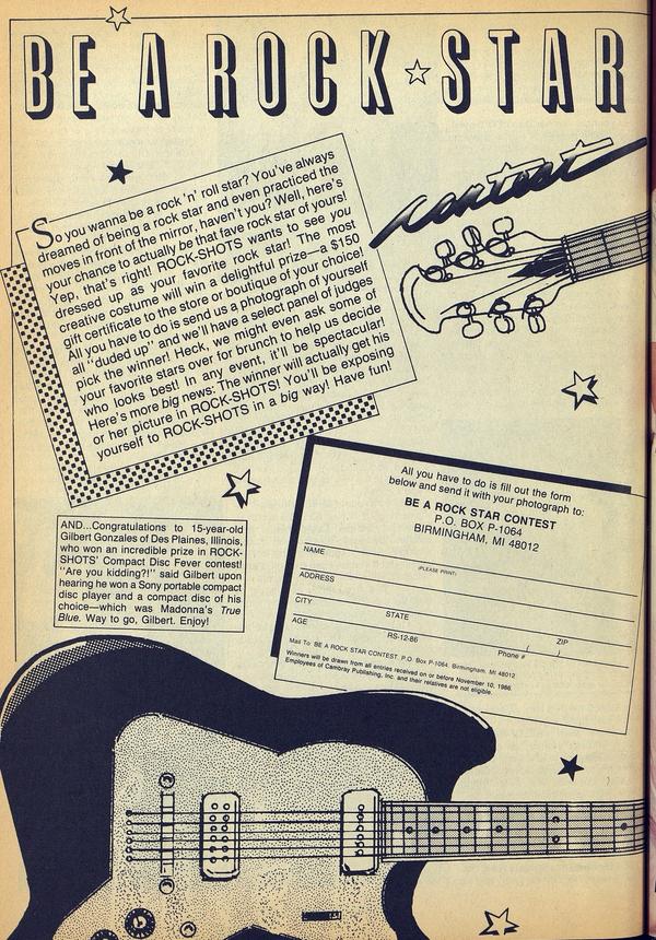 So you you wanna be a rock 'n' roll star? You've always dreamed of being a rock star and even practiced the moves in front of the mirror, haven't you? Well, here's your chance to actually be that fave rock star of yours! Yep, that's right! ROCK-SHOTS wants to see you dressed up as your favorite rock star!