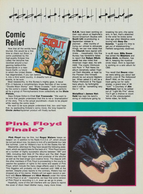 Now that all the worlds have blurred, this would be a fine time to check out Scout, a comic published by the high-quality Eclipse line. Lately the storyline has revolved around a burgeoning battle-of-the-blues-bands in a near-future Earth—a future in which the United States has degenerated, if you can believe it, into a third world country.