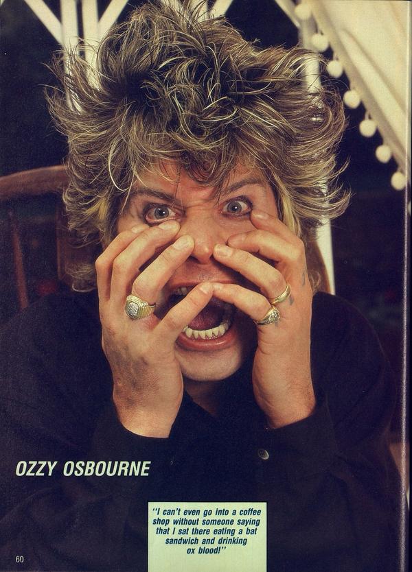 "I can't even go into a coffee shop without someone saying that I sat there eating a bat sandwich and drinking ox blood!" "I am schizophrenic. I don't look now like the fiend on the album cover or the guy that comes down on the throne, do I?"