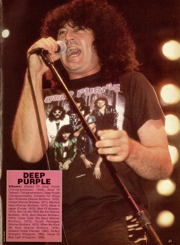 Albums: Shades Of Deep Purple (Tetragrammaton, 1968), Book Of Taliesyn (Tetragrammaton), Deep Purple (Tetragrammaton), Concerto For Group And Orchestra (Warner Brothers, 1970), Fireball (Warner Brothers, 1971), Machine Head (Warner Brothers, 1972), Made In Japan (Purple, 1972), Best Of (Scepter, 1972), Who Do We Think We Are (Warner Brothers, 1973), Burn (Warner Brothers, 1974), Come Taste The Band (Warner Brothers, 1975), Purple Passages (Warner Brothers, 1972), When We Rock We Rock (Warner Brothers, 1978), Deepest Purple (Harvest, 1980), Perfect Strangers (Polygram, 1985), House Of Blue Light (Polygram, 1986).