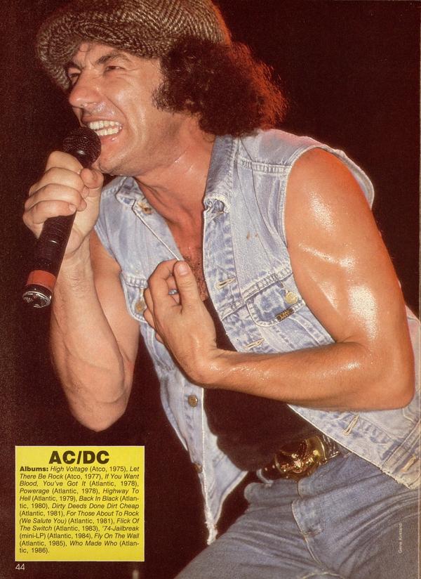 Albums: High Voltage (Atco, 1975), Let There Be Rock (Atco, 1977), If You Want Blood, You’ve Got It (Atlantic, 1978), Powerage (Atlantic, 1978), Highway To Hell (Atlantic, 1979), Back In Black (Atlantic, 1980), Dirty Deeds Done Dirt Cheap (Atlantic, 1981), For Those About To Rock (We Salute You) (Atlantic, 1981), Flick Of The Switch (Atlantic, 1983), ’74-Jailbreak (mini-LP) (Atlantic, 1984), Fly On The Wall (Atlantic, 1985), Who Made Who (Atlantic, 1986).