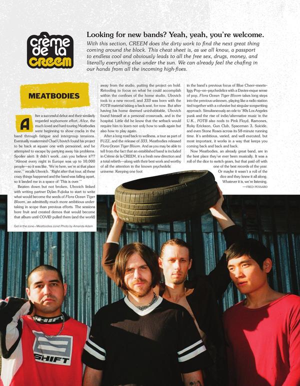 MEATBODIES After a successful debut and their similarly regarded sophomore effort, Alice, the much-loved and hard-touring Meatbodies were beginning to show cracks in the band through fatigue and intergroup tensions. Eventually mastermind Chad Ubovich found his project to be back at square one with personnel, and he attempted to escape by partying away his problems.