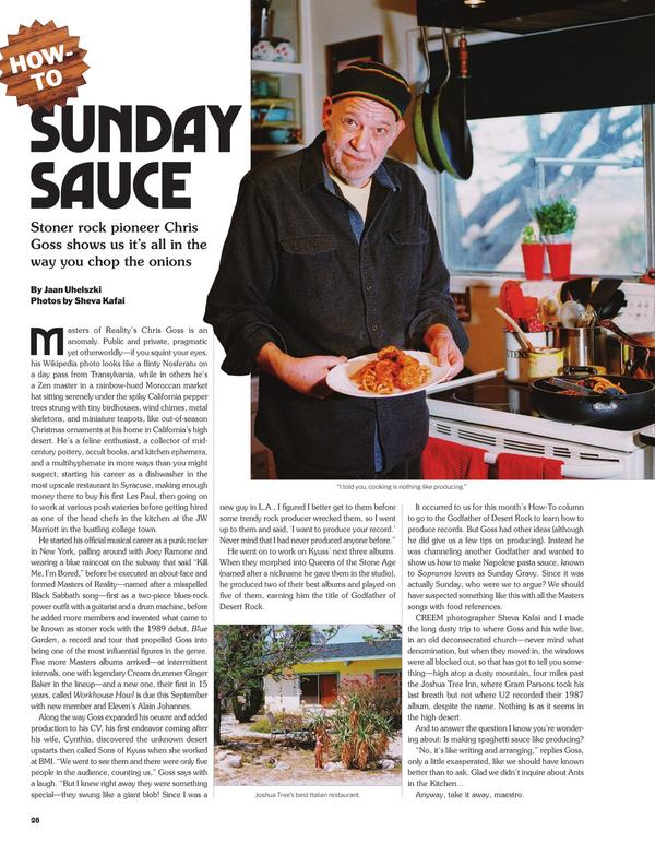 Masters of Reality’s Chris Goss is an anomaly. Public and private, pragmatic yet otherworldly—if you squint your eyes, his Wikipedia photo looks like a flinty Nosferatu on a day pass from Transylvania, while in others he’s a Zen master in a rainbow-hued Moroccan market hat sitting serenely under the spiky California pepper trees strung with tiny birdhouses, wind chimes, metal skeletons, and miniature teapots, like out-of-season Christmas ornaments at his home in California’s high desert.