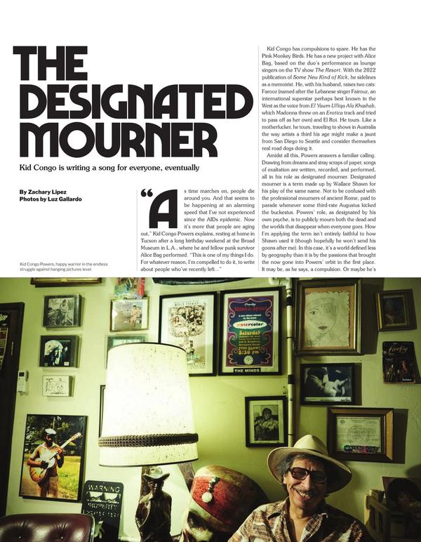 "As time marches on, people die around you. And that seems to be happening at an alarming speed that I’ve not experienced since the AIDs epidemic. Now it’s more that people are aging out,” Kid Congo Powers explains, resting at home in Tucson after a long birthday weekend at the Broad Museum in L.A., where he and fellow punk survivor Alice Bag performed.