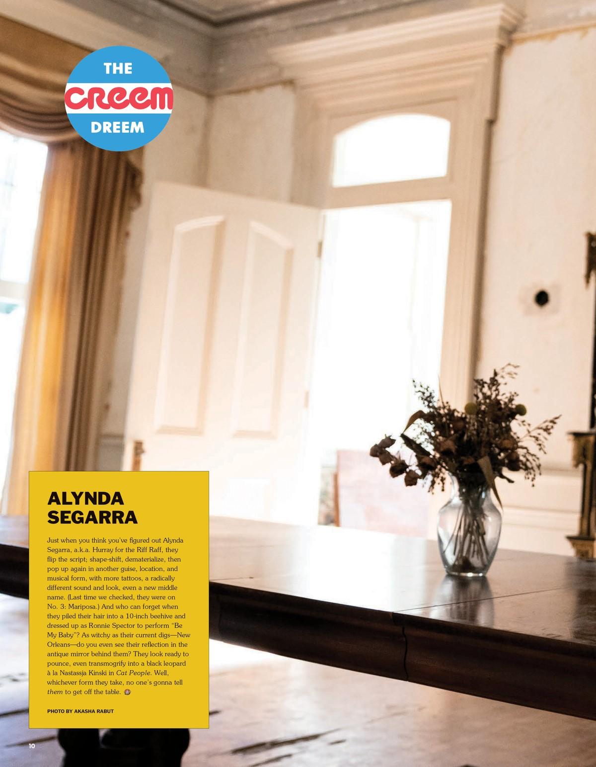 Just when you think you’ve figured out Alynda Segarra, a.k.a. Hurray for the Riff Raff, they flip the script; shape-shift, dematerialize, then pop up again in another guise, location, and musical form, with more tattoos, a radically different sound and look, even a new middle name. (Last time we checked, they were on No. 3: Mariposa.) And who can forget when they piled their hair into a 10-inch beehive and dressed up as Ronnie Spector to perform “Be My Baby”? As witchy as their current digs—New Orleans—do you even see their reflection in the antique mirror behind them? They look ready to pounce, even transmogrify into a black leopard a la Nastassja Kinski in Cat People. Well, whichever form they take, no one’s gonna tell them to get off the table.