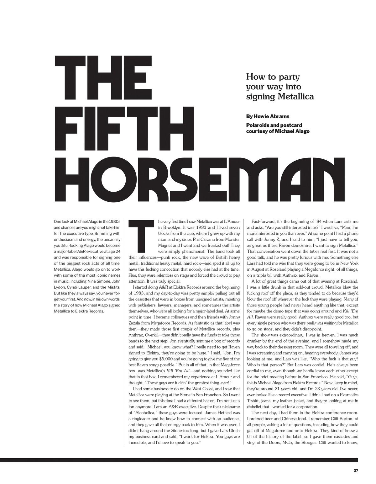 One look at Michael Alago in the 1980s and chancesare you might not take him for the executive type. Brimming with enthusiasm and energy, the uncannily youthful-looking Alago would become a major-label A&R executive at age 24 and was responsible for signing one of the biggest rock acts of all time: Metallica. Alago would go on to work with some of the most iconic names in music, including Nina Simone, John Lydon, Cyndi Lauper, and the Misfits. But like they always say, you never forget your first. And now, in his own words, the story of how Michael Alago signed Metallica to Elektra Records.