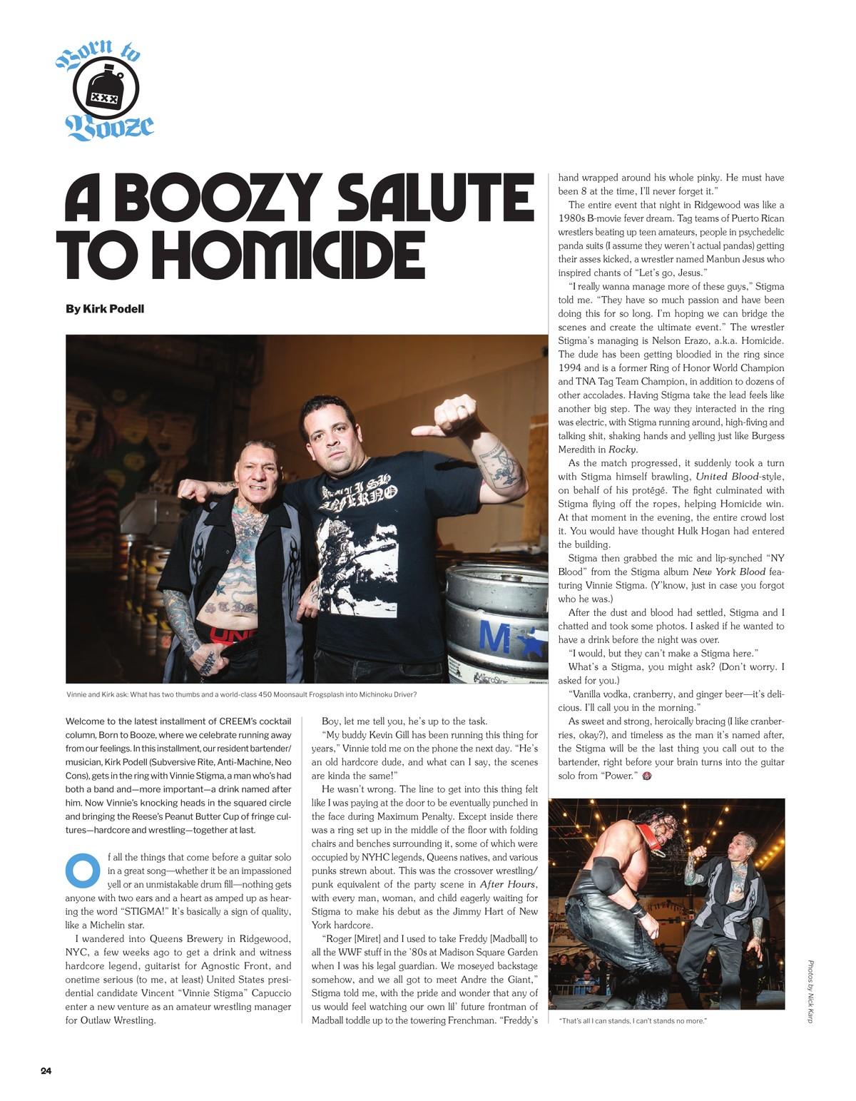 Welcome to the latest installment of CREEM’s cocktail column, Born to Booze, where we celebrate running away from our feelings. In this installment, our resident bartender/ musician, Kirk Podell (Subversive Rite, Anti-Machine, Neo Cons), gets in the ring with Vinnie Stigma, a man who’s had both a band and—more important—a drink named after him. Now Vinnie’s knocking heads in the squared circle and bringing the Reese’s Peanut Butter Cup of fringe cultures—hardcore and wrestling—together at last.