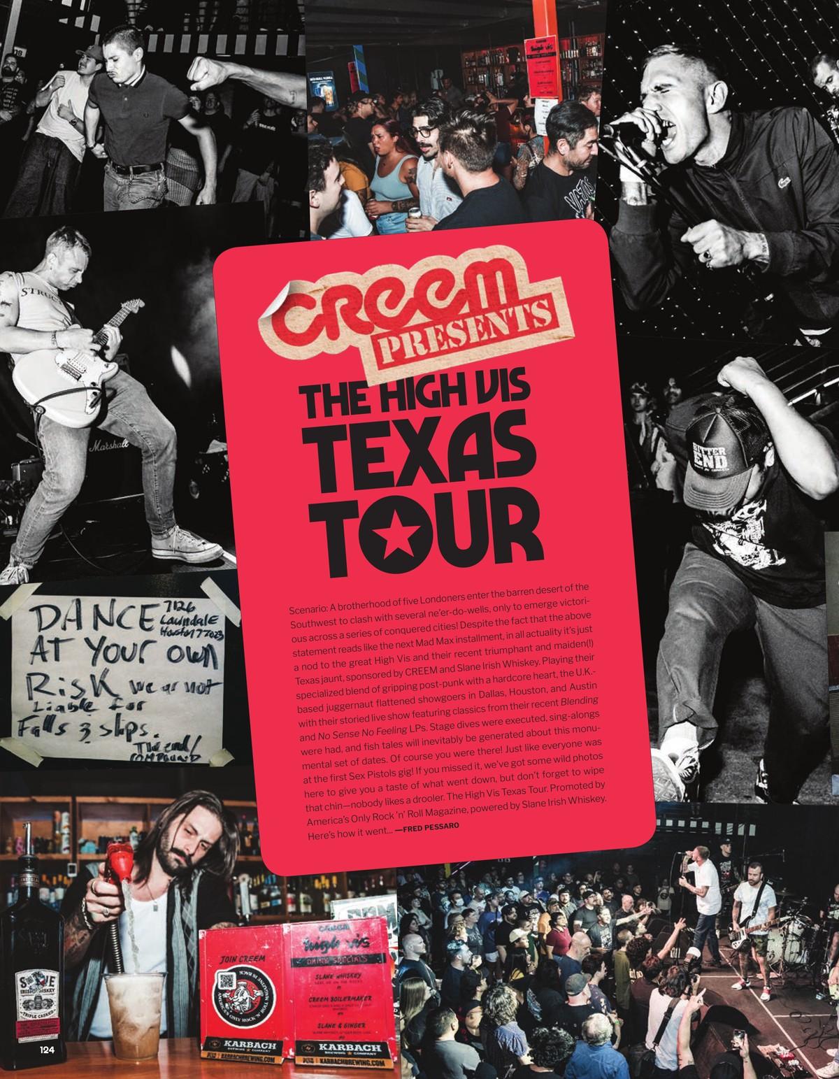Scenario: A brotherhood of five Londoners enter the barren desert of the Southwest to clash with several ne’er-do-wells, only to emerge victorious across a series of conquered cities! Despite the fact that the above statement reads like the next Mad Max installment, in all actuality it’s just a nod to the great High Vis and their recent triumphant and maiden(!) Texas jaunt, sponsored by CREEM and Slane Irish Whiskey. Playing their specialized blend of gripping post-punk with a hardcore heart, the U.K.-based juggernaut flattened showgoers in Dallas, Houston, and Austin with their storied live show featuring classics from their recent Blending and No Sense No Feeling LPs. Stage dives were executed, sing-alongs were had, and fish tales will inevitably be generated about this monumental set of dates. Of course you were there! Just like everyone was at the first Sex Pistols gig! If you missed it, we’ve got some wild photos here to give you a taste of what went down, but don’t forget to wipe that chin—nobody likes a drooler. The High Vis Texas Tour. Promoted by America’s Only Rock ’n’ Roll Magazine, powered by Slane Irish Whiskey. Here’s how it went...