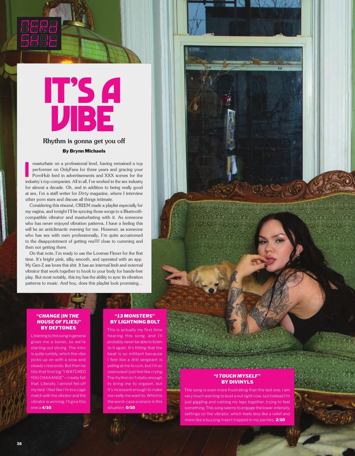 Considering this resume, CREEM made a playlist especially for my vagina, and tonight I’ll be syncing those songs to a Bluetoothcompatible vibrator and masturbating with it. As someone who has never enjoyed vibration patterns, I have a feeling this will be an anticlimactic evening for me. However, as someone who has sex with men professionally, I’m quite accustomed to the disappointment of getting realIII close to cumming and then not getting there.