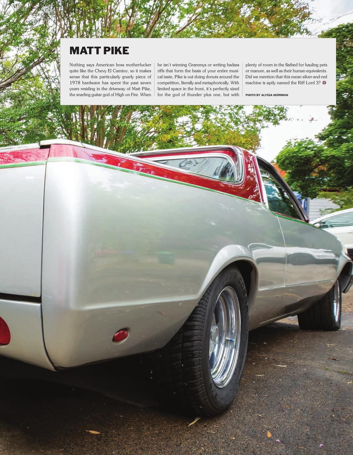 Nothing says American boss motherfucker quite like the Chevy El Camino, so it makes sense that this particularly gnarly piece of 1978 hardware has spent the past seven years residing in the driveway of Matt Pike, the snarling guitar god of High on Fire. When he isn’t winning Grammys or writing badass riffs that form the basis of your entire musical taste, Pike is out doing donuts around the competition, literally and metaphorically. With limited space in the front, it’s perfectly sized for the god of thunder plus one, but with plenty of room in the flatbed for hauling pets or manure, as well as their human equivalents. Did we mention that this mean silver-and-red machine is aptly named the Riff Lord 3?