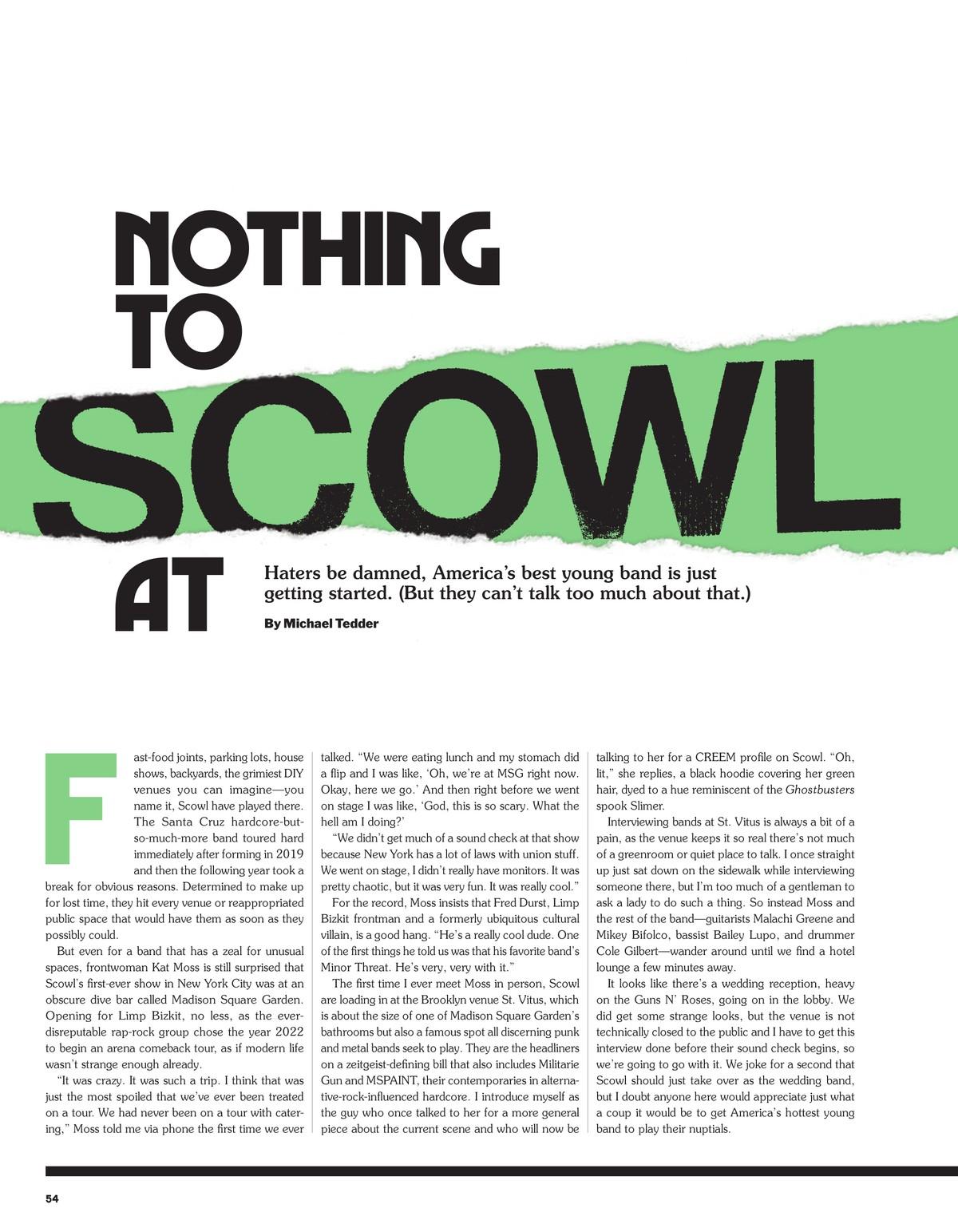 But even for a band that has a zeal for unusual spaces, frontwoman Kat Moss is still surprised that Scowl’s first-ever show in New York City was at an obscure dive bar called Madison Square Garden. Opening for Limp Bizkit, no less, as the everdisreputable rap-rock group chose the year 2022 to begin an arena comeback tour, as if modern life wasn’t strange enough already.